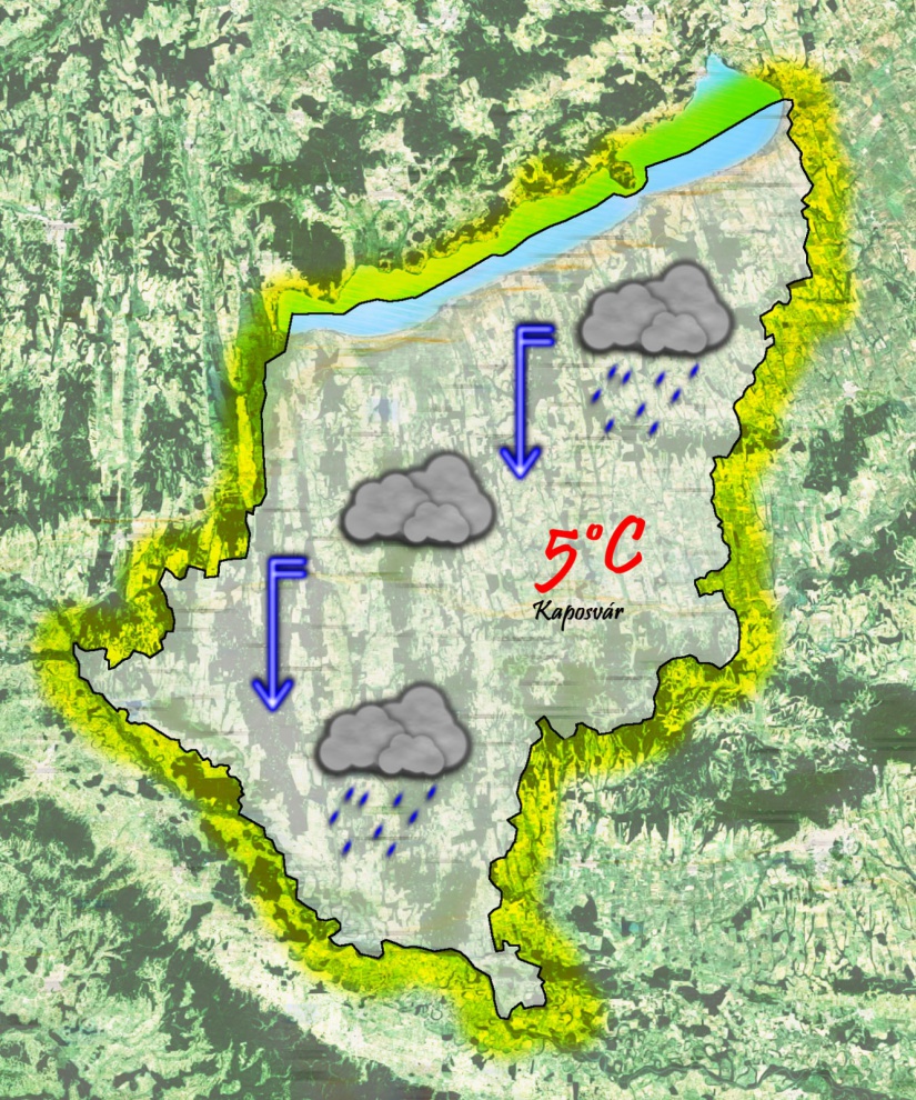 Pénteken reggel már hópelyhek is keveredhetnek az esőbe, ám inkább a szél okozhat gondot. Erős, olykor viharos északi szélre számíthatunk. A komoly széllökések miatt a Balaton a déli partokon kiléphet a medréből. Napközben az időszakos esők közben csak 5-6°C-ig melegszik a levegő hőmérséklete. Délutánra gyengül a szél, de még így is nyugtalan és kellemetlen időjárásra számíthatunk.