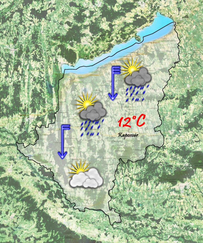 Szombaton reggel 4°C-ig csökken a hőmérséklet. Továbbra is erős északi szél fúj majd. Emiatt ismét kiléphet a Balaton a medréből a magas vízállás miatt. Elszórtan záporok előfordulhatnak reggel. Délután erősen felhős lesz az ég és bárhol lehet egy-egy záporeső. 10°C-ig melegszik a levegő hőmérséklete, de jóval hűvösebbnek fogjuk érezni azt az erős szél miatt.