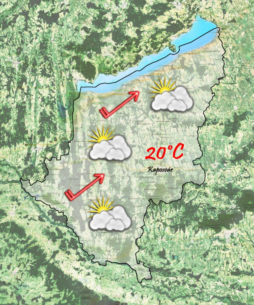 Szerda délutánig erősen felhős lesz az égbolt, ám akkor egyre többfelé kezdődik meg a felhőzet felszakadozása. A hőmérséklet a melegfronti hatás miatt a magasba szökik. Már ezen a napon elérheti a 20 °C maximumot. Élénk és meleg lesz a délnyugati szél.