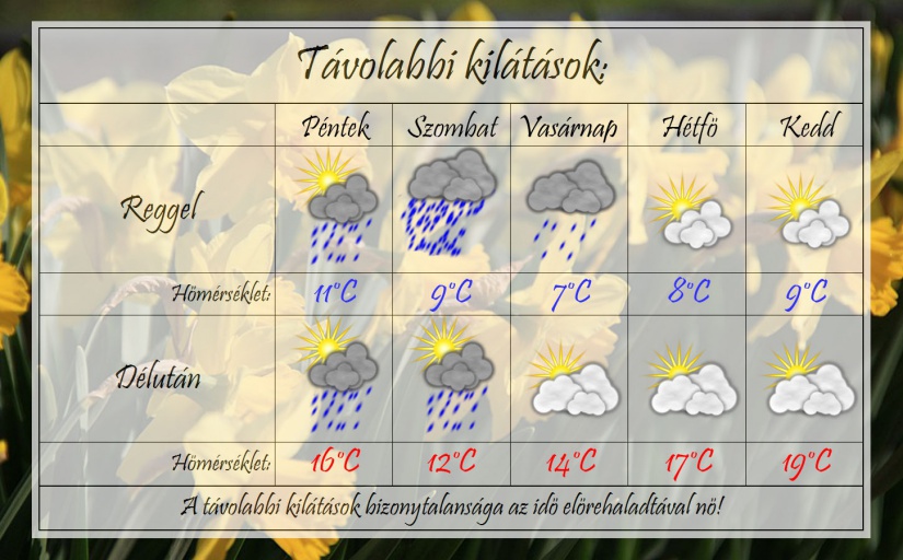Péntek reggelén beborul az ég és továbbra is számíthatunk záporokra. 10°C-ig hűl a levegő a felhőzetnek köszönhetően. Ekkor már északi szél fog fújni. Délutánra a záporos időt egyre inkább esős idő váltja fel és a hőmérséklet emelkedése is megtorpan. Maximum 16-18°C-ig kúszik fel a hőmérő higanyszála.