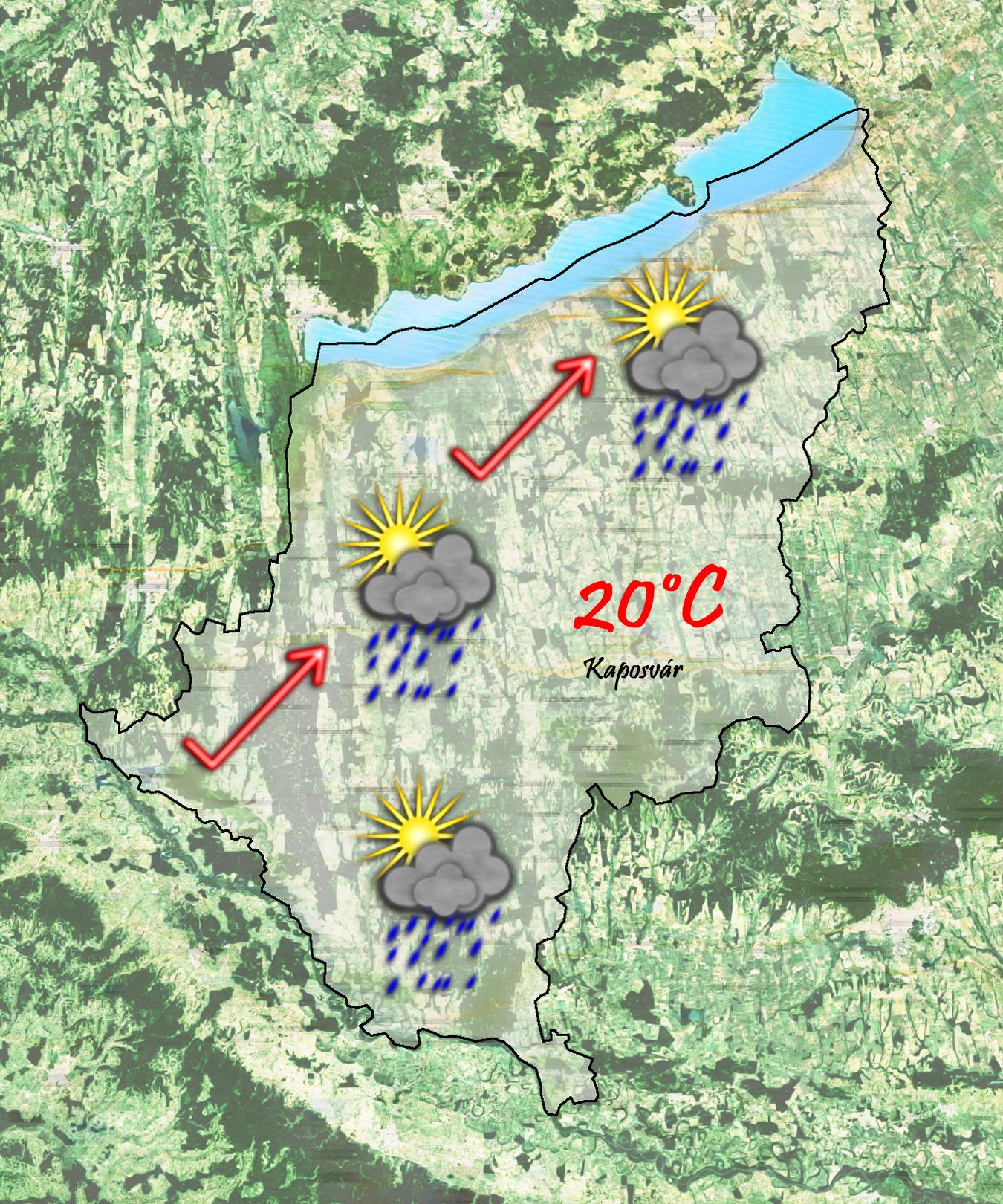 Szombaton reggel csak 8 °C-ig hűl a levegő a sok felhő miatt. Délutánra sokfelé alakul ki zápor, néhol zivatar is lehetséges. A maximumhőmérséklet még mindig el fogja érni a 20 °C-ot. A szél délnyugati lesz. Estére a csapadék egyre inkább esőbe vált.