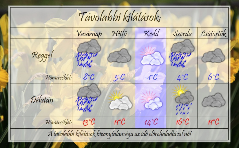 A jövő héten az erőteljes lehűlés megérezteti a hatását. Csípősek lesznek a reggelek és hűvösek a nappalok, így kedden nagy esély van fagyveszélyre. Sokfelé előfordulhat komolyabb fagy is akár. A hét közepén újabb frontrendszer érkezik, amely ismét lehűlést hozhat, olyannyira, hogy akár havaseső is előfordulhat.