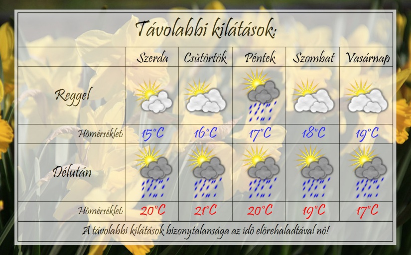 Napról napra több felhő lesz az égbolton és szinte bármikor előfordulhat egy-egy zápor. A délutáni órákban akár zivatar is lehetséges, ám igazán tavaszias hőmérsékletek valószínűek.