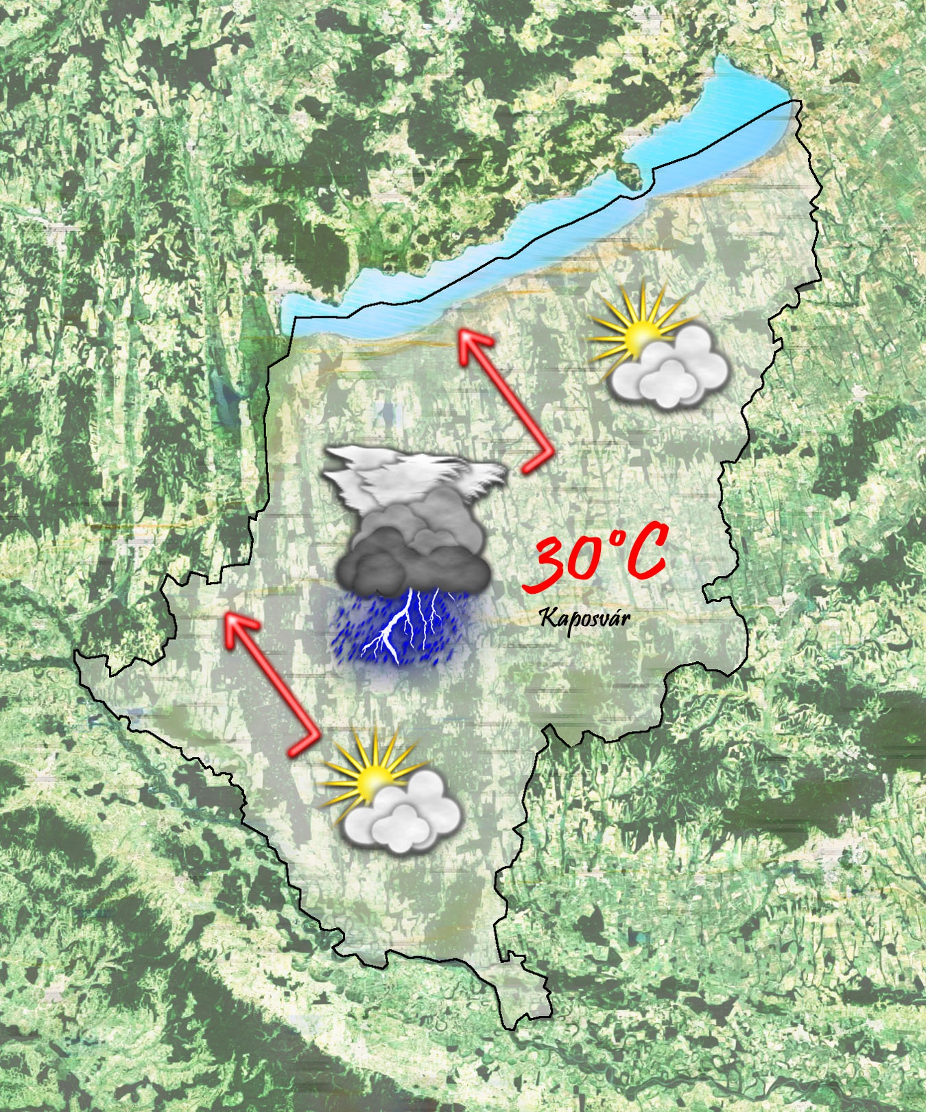 Vasárnap reggel 15 °C-ig csökken a hőmérséklet, igazán kellemes, de néha már fülledt időre van kilátás. Délután ismét a 30 °C-ot érinti a hőmérő higanyszála, de késő délután, este egy front érkezik amelyből zápor, zivatar, néhol jégeső is előfordulhat. A szél gyenge délkeleti lesz, azonban a zivatarok környezetében megerősödik majd.