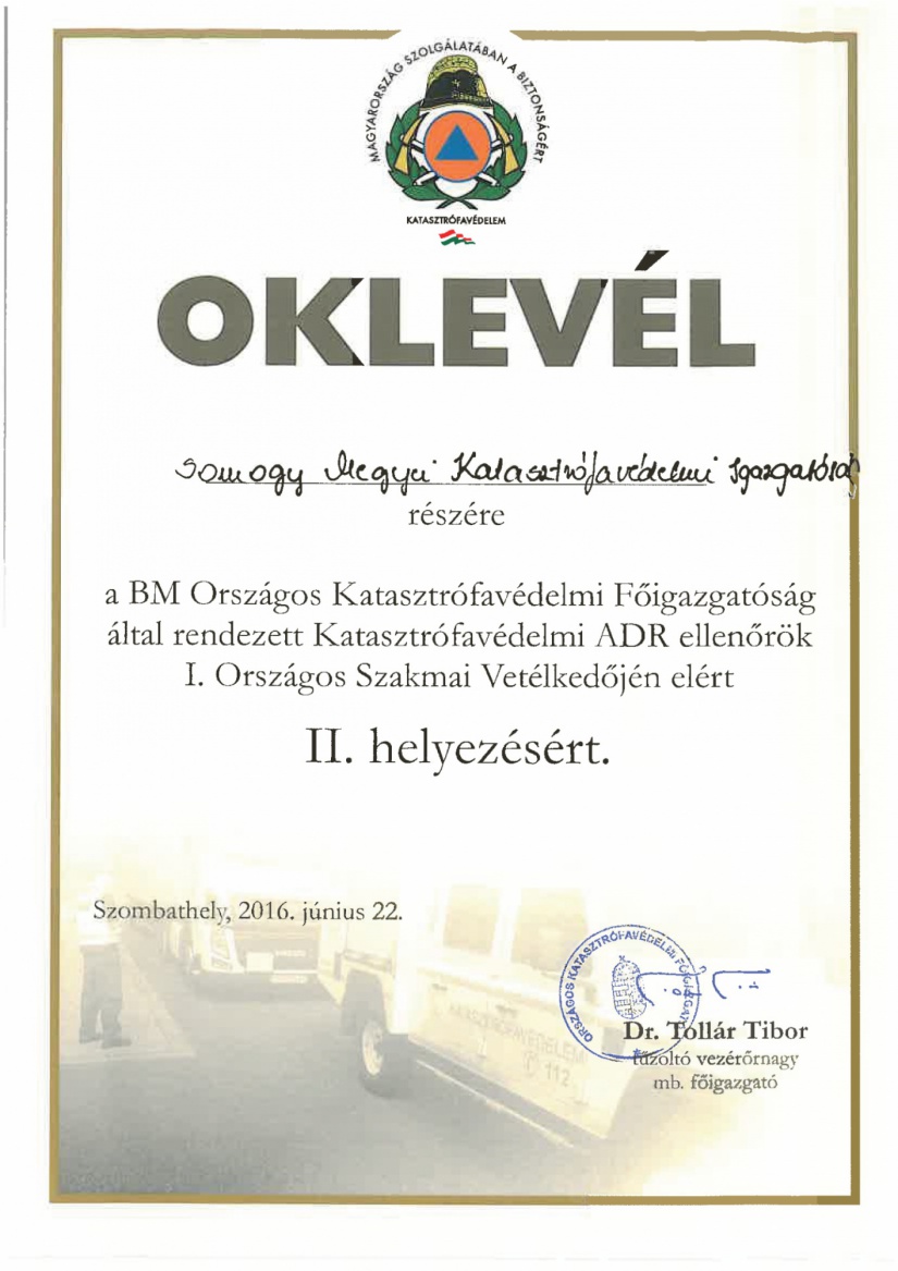 Szombathelyen, június 20-22. között rendezték meg a katasztrófavédelmi ADR-ellenőrök első országos szakmai vetélkedőjét. A veszélyes áruk közúti szállításának kontrollját végző kollégák között a Somogy megyei páros a második lett, és egy különdíj büszke tulajdonosa.