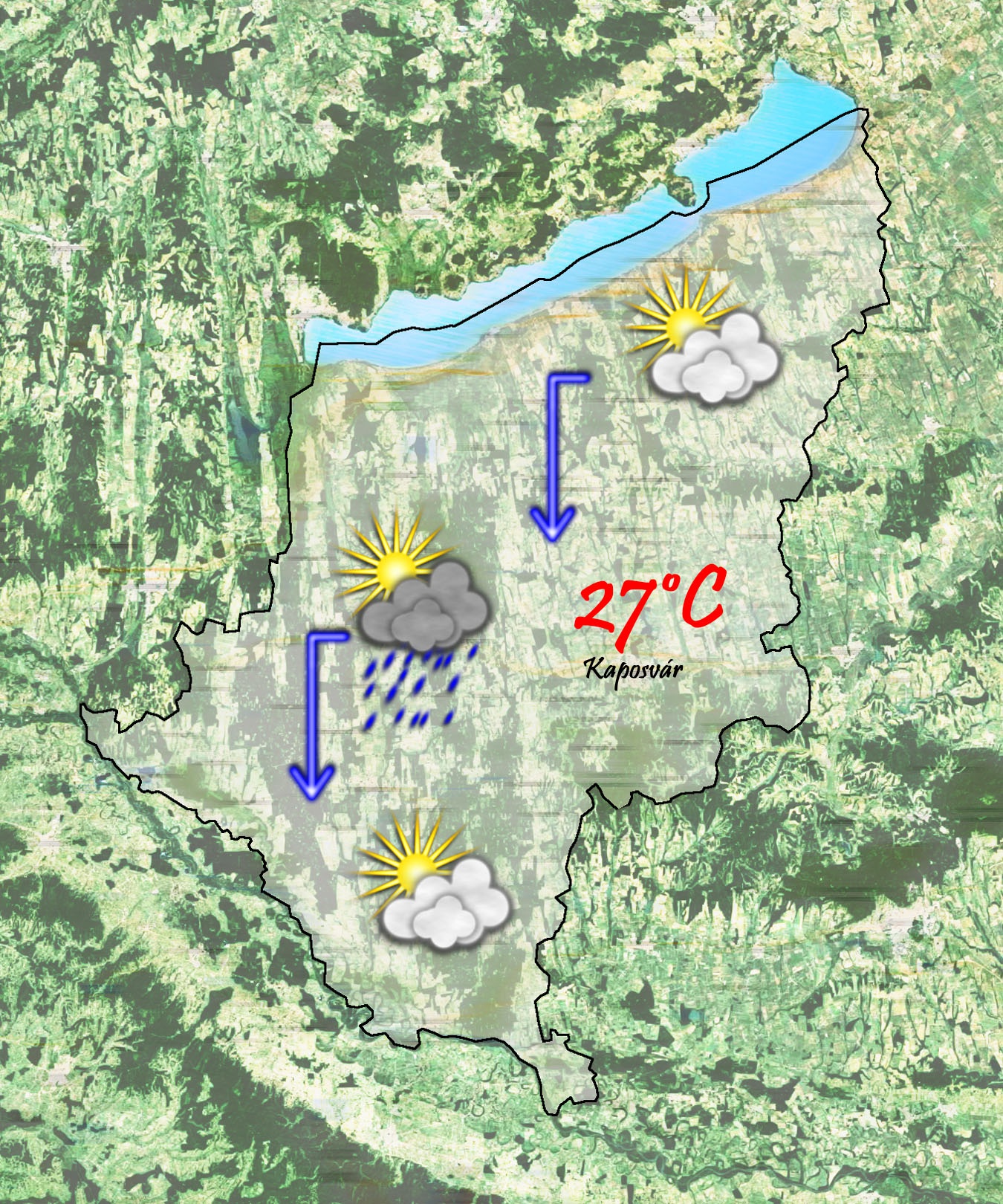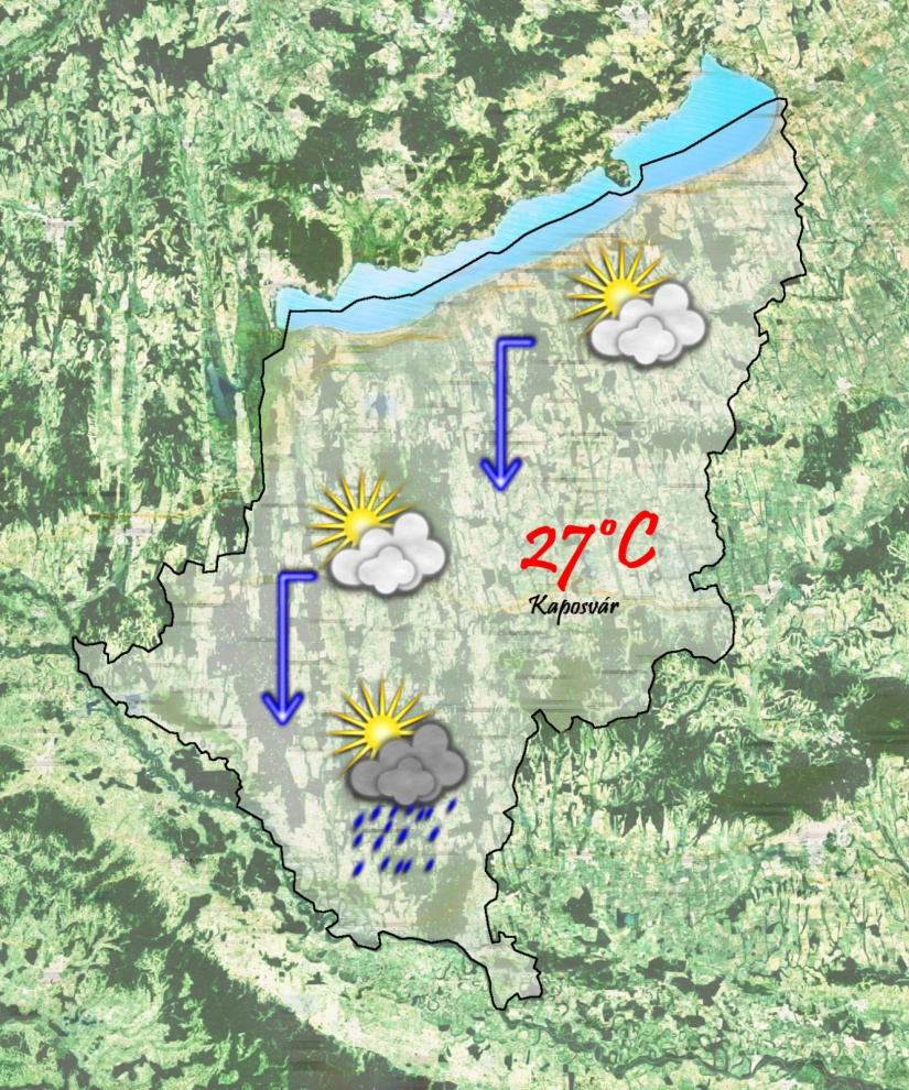 Szerdán reggel változóan felhős lesz az ég és 13 °C-ig hűl le a levegő. Napközben a 26 °C-ot is elérheti a hőmérséklet. Délután ismét megszaporodnak a gomolyfelhők, és ezekből újra várható néhol csapadék. Az északi szél egyre inkább gyengülőben lesz.