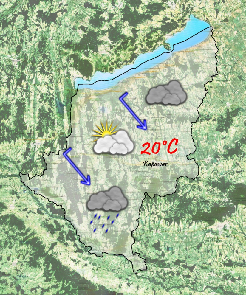 Hétfőn napközben sokszor fog esni az eső, majd délután a csapadéktevékenység egyre inkább keletre tolódik. Borult, felhős idő várható, csupán estétől kezdődik meg a felhőzet felszakadozása nyugat felől. Délutánra csak 20°C-ig emelkedik a hőmérséklet. Élénk északnyugati szél fúj majd.