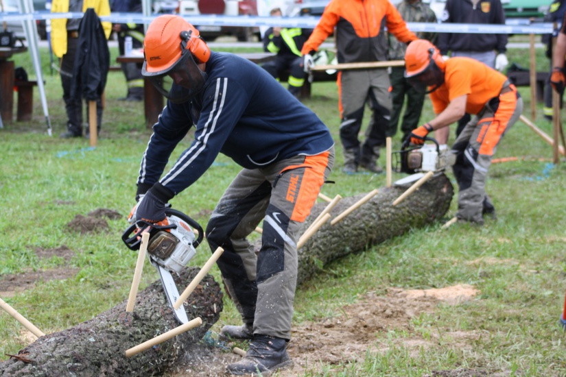 Az égi áldás csillapodásával a kombinált verseny is elrajtolt. Hol szemerkélő esőben, hol ragyogó napsütésben lépett pályára elsőként a csapatok motorfűrész-kezelője, aki egy minimum harminc, maximum nyolcvan milliméter vastagságú korongot vágott le egy rönkről. A korong földre érkezését követően a csapat többi tagja is hozzáfoghatott feladatához, két, egyenként négy méteres rönköt kellett legallyazni, majd egyméteres választékokra darabolni, félbehasítani és sarangba (rakatba) rakni.