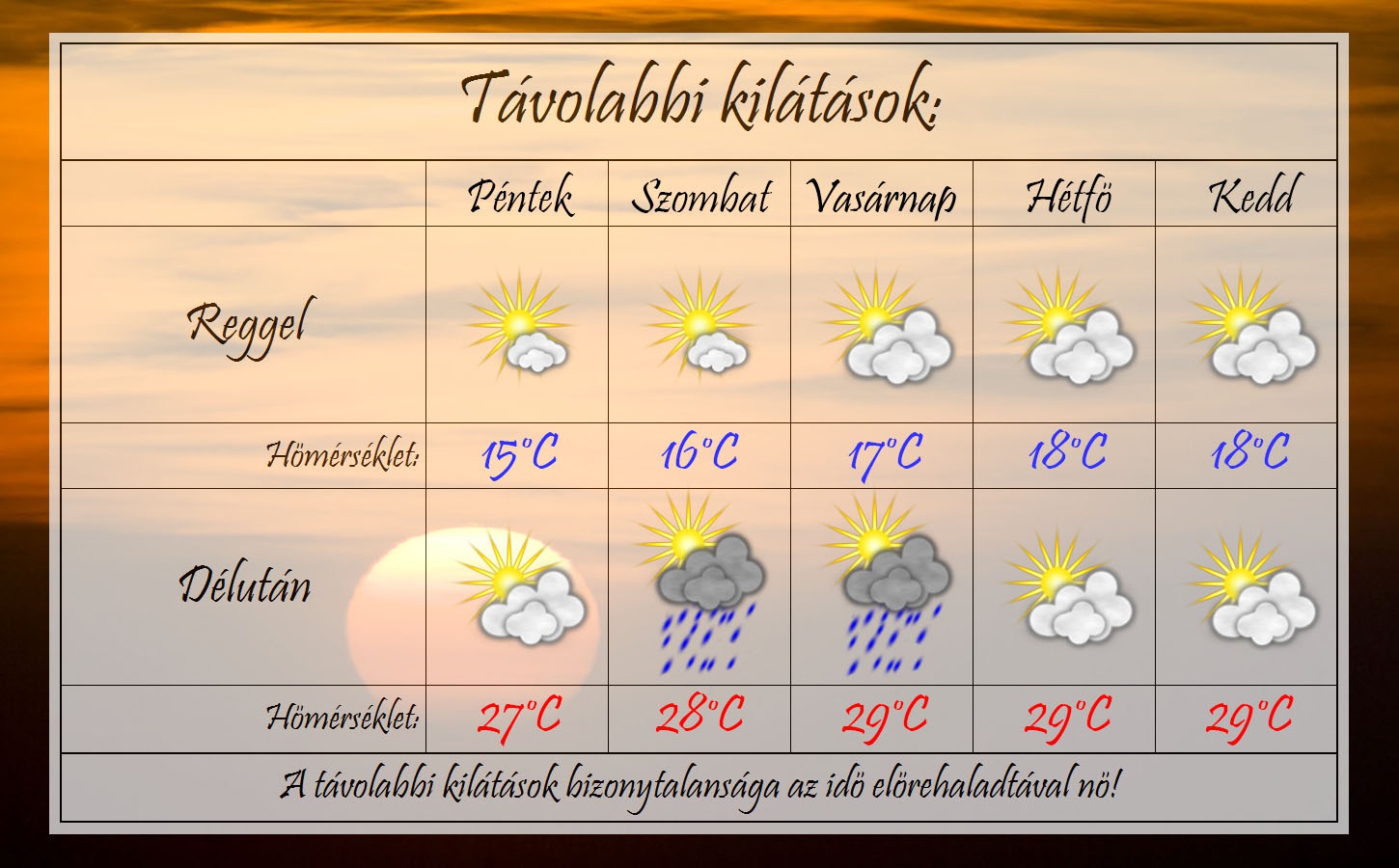 Pénteken reggel 15°C-ig csökken a hőmérséklet. Nyugodt és meleg idő valószínű. 29°C-on tetőzik a hőmérséklet. Délután megszaporodnak a gomolyfelhők, de ezekből csapadék nem várható.