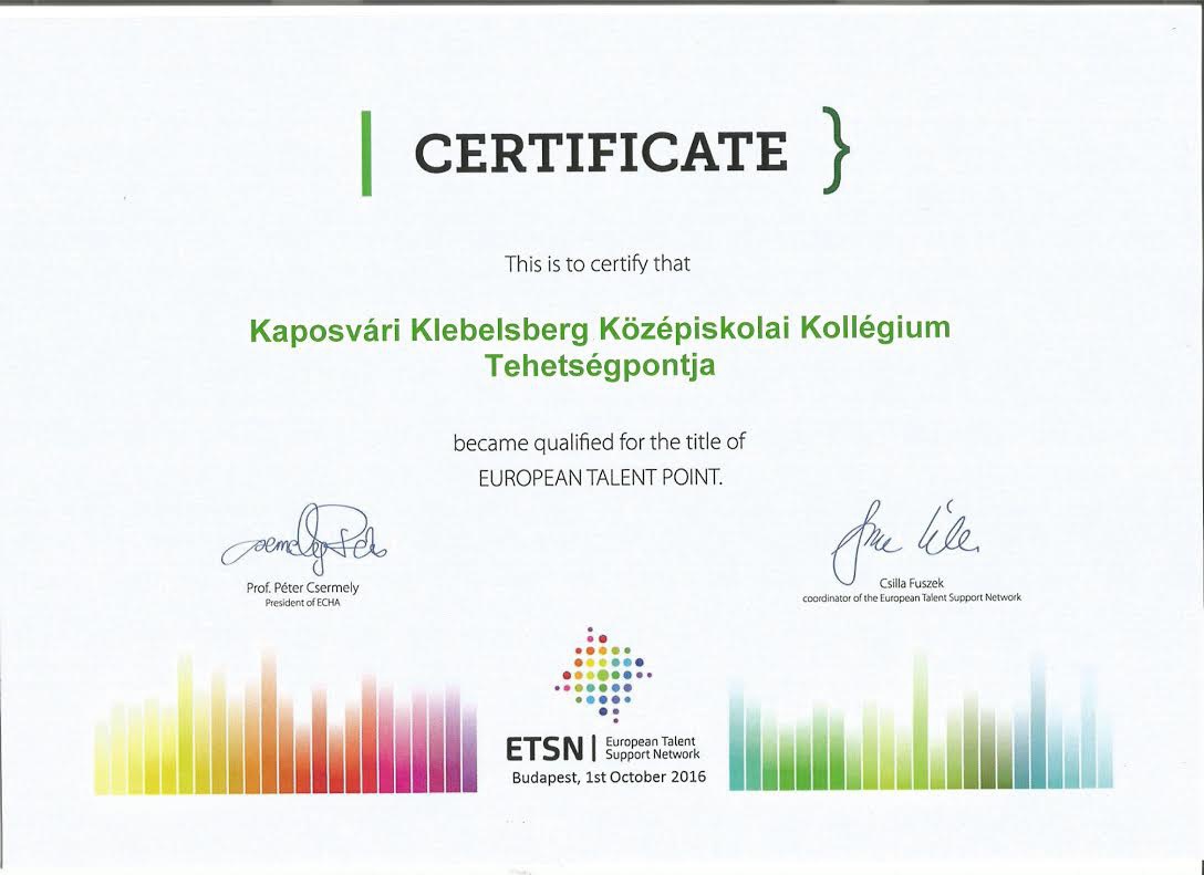 Somogy megyéből Európai Tehetségponttá három intézmény vált. A Kaposvári Festetics Karolina Központi Óvoda Tehetségpontja, a Kaposvári Munkácsy Mihály Gimnáziumban működő tematikus Lóczy Lajos Geográfiai Tehetségpont, valamint a Kaposvári Klebelsberg Középiskolai Kollégium Tehetségpontja. Az Európai Tehetséghálózat egy újonnan felálló rendszer, a három Somogy megyei tehetségpont a hazai sikeres akkreditációkon túl mától az európai hálózatépítés feladatellátásba is becsatlakozik.