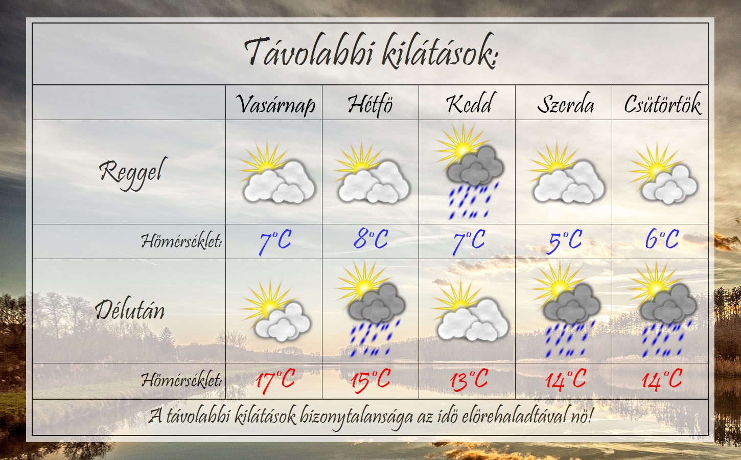 A jövő héten igen változékony idő várható. Szinte bármikor lehet eső, zápor. A napsütést gyakran zavarják a felhők. Reggelente enyhe idő várható. Nem kell tartani fagyveszélytől, míg délutánonként szintén 13-15 °C-ig kúszik csak fel a hőmérséklet. Gyakran fog fújni a szél délkelet felől.