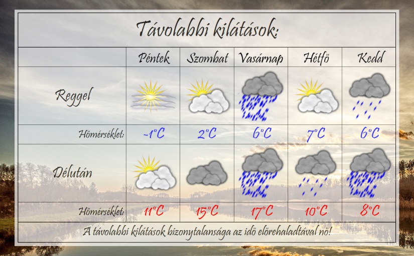Pénteken reggel viszont igen hűvös lesz. Sokfelé fagyni fog. A derült ég alatt többfelé képződik majd köd. -2-0°C-ig csökken a hőmérséklet. Napközben változóan felhős lesz az ég. Átfordul a szél délire és enyhülés kezdődik. Délutánra 11°C-ig emelkedik a hőmérséklet.