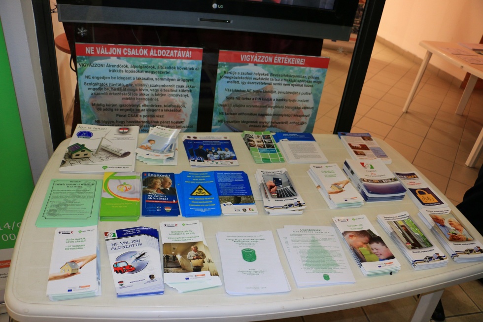 A fiatalok "Bűnmegelőzés" feliratú pólóban figyelmeztetik az óvatlan vásárlókat értékeik fokozott védelmére, valamint bűnmegelőzési kiadványokat osztanak.