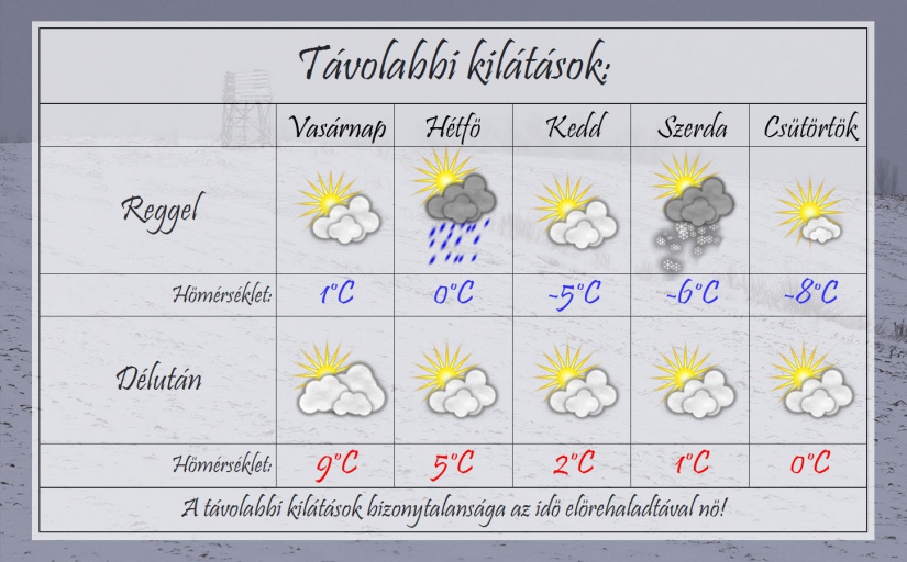 A jövő hét első felében komoly lehűlés várható egy markáns hidegfront érkezése miatt. A maradék köd is felszakadozik és megszűnik a nedves, párás, ködös idő. A reggeli fagyok ismét megerősödnek, míg napközben kevéssel fagypont felett alakul majd a hőmérséklet. A hét elején és szerdán lehetséges kisebb csapadék, mely egyre inkább hózáporokra vált. Visszatér a télies idő, egyelőre hó nélkül.