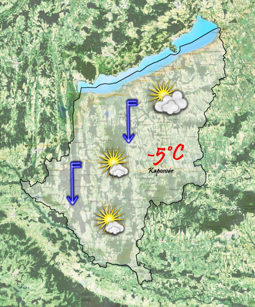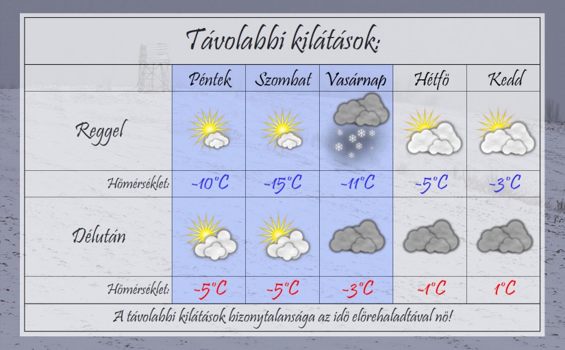 Pénteken reggel már igen hűvös lesz. A gyengén felhős ég alatt -8°C,-10°C-ig csökken a hőmérséklet. Napközben gyengén felhős lesz az ég. Továbbra is fújni fog az északi szél. Délutánra a komoly hideg miatt már nem éri el a hőmérséklet a 0°C-ot, hanem -5 és -3°C között lesz majd a maximum.