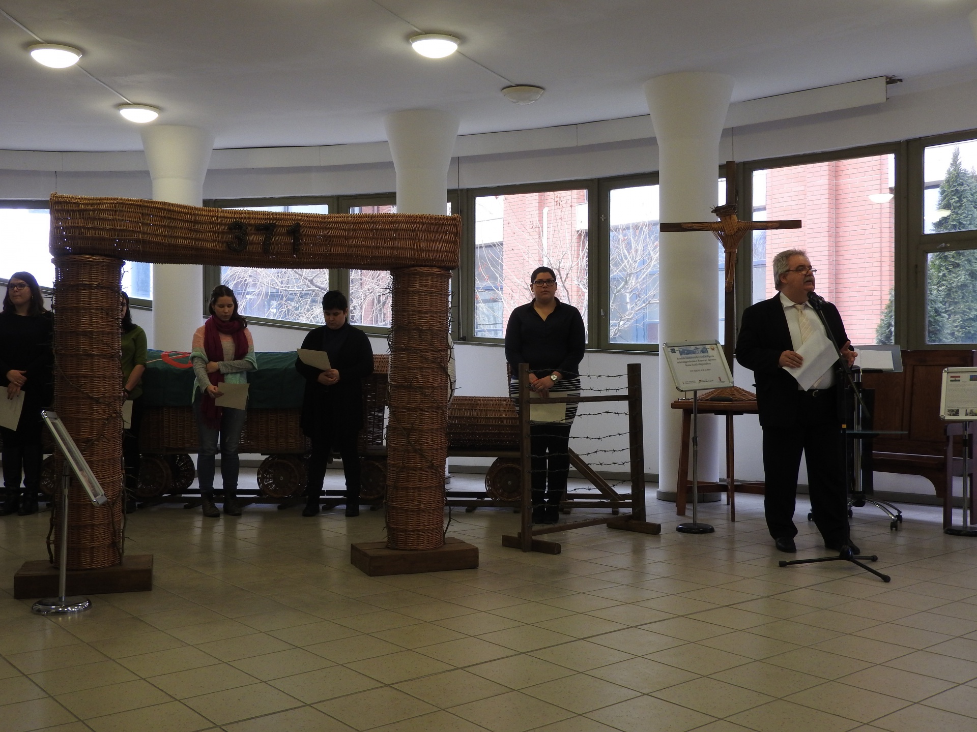 A rendhagyó kiállítás Kakas József népművész alkotása. A vesszőfonatokból készült szoboregyüttes a holokauszt áldozatai előtt tisztelgő szimbólumokból áll. Így a művész megformálta a romákat szállító vagonokat valamint az auschwitzi tábort jelképező szögesdrótot és kaput. Utóbbin a 371-es szám szerepel, ennyi roma csecsemő született ugyanis a táborban, közülük senki nem élte túl a szörnyűségeket. A kiállítás ilyen módon a 371 gyermeknek is szeretne méltó emléket állítani.