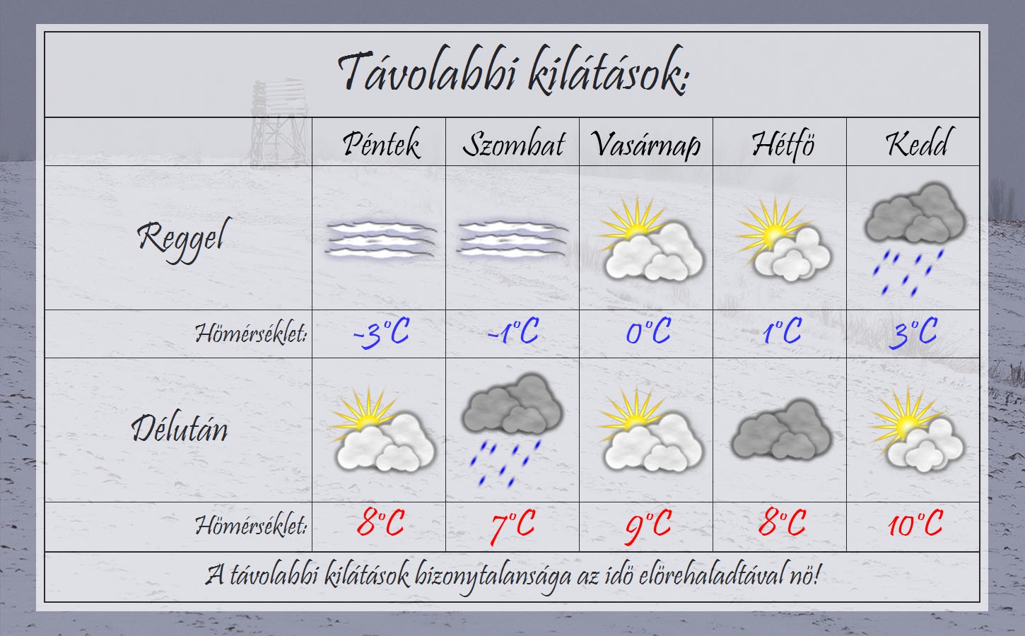 A hétvégén igen bizonytalan változóan felhős, borult idő várható. Csapadékra is van esély, leginkább eső, havaseső formában. Reggelente fagypont körül alakul a hőmérséklet, míg délután 5°C körül várható a maximumhőmérséklet. Reggelente lehet számítani ködre. A jövő héttől változás kezdődik időjárásunkban. Nyugatira fordul a szél és hozza az enyhülés és a változékonyságot. Délutánonként enyhe, de szeszélyes időre lehet majd számítani.