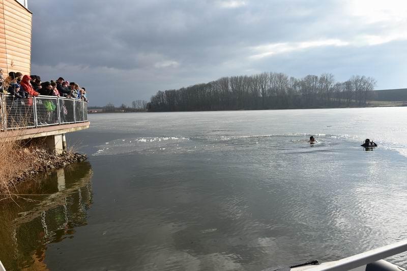 A Deseda toponári oldalán a jég sportolásra alkalmatlan. A kaposváriak tegnap a KÖTÉL Egyesület tűzoltóinak bemutatója során azt is láthatták, hogyan segítsünk magunkon, ha a jeges vízbe esünk. Schirilla György is megmártózott a tóban az önkéntesek biztosítása mellett.