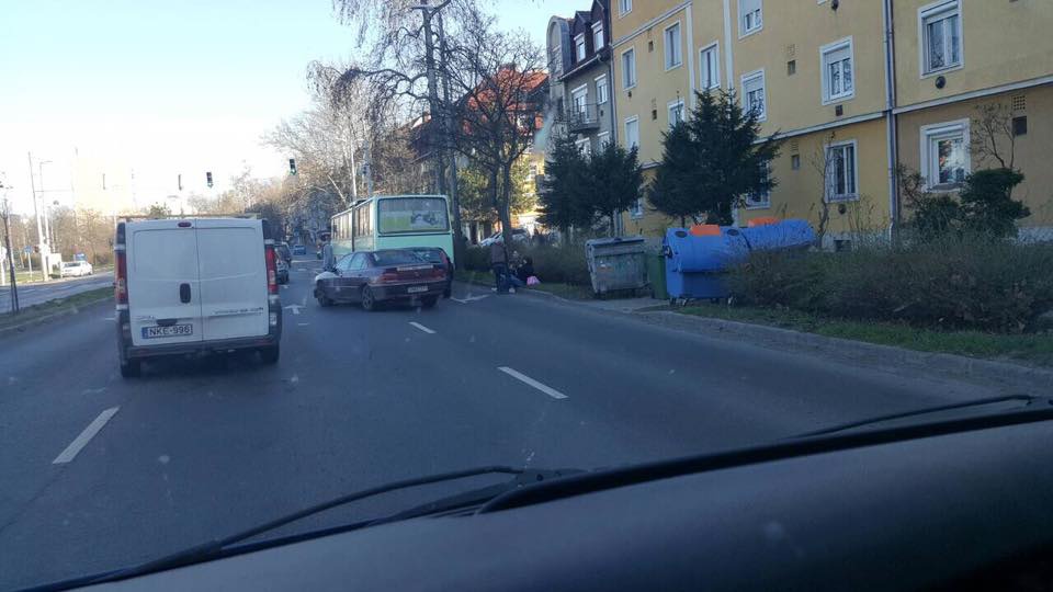 Baleset történt a Berzsenyi utcában a Füredi csomópont felé vezető úton. Egy gépjármű nekihajtott az előtte fékező járműnek és beletolta az előttük haladó autóbuszba. A baleset helyszínén a külső sávot lezárták, a belső sávban halad a forgalom, torlódásra lehet számítani.