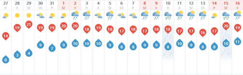 Szerdán kezdetben napos időre lehet számítani. Késő délutántól északkeleten, északon többfelé megnövekszik a felhőzet, és egy-egy zápor is előfordulhat. Emellett sokfelé megélénkül, északon helyenként meg is erősödik a szél. A leghidegebb órákban 0-5 fok lehet, a fagyzugokban várható gyenge fagy. A nappali maximumok 19 és 23 fok között alakulnak.