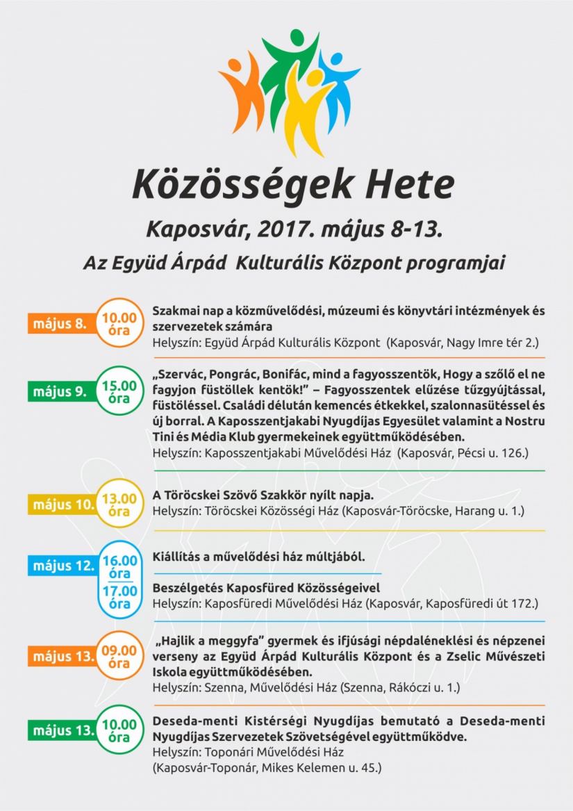 Országszerte csaknem kilencszáz rendezvény tartanak a ma kezdődő Közösségek Hete elnevezésű programsorozaton. Kaposváron és a környékbeli falvakban az Együd Árpád Kulturális Központ szervezésében lesznek programok a héten.