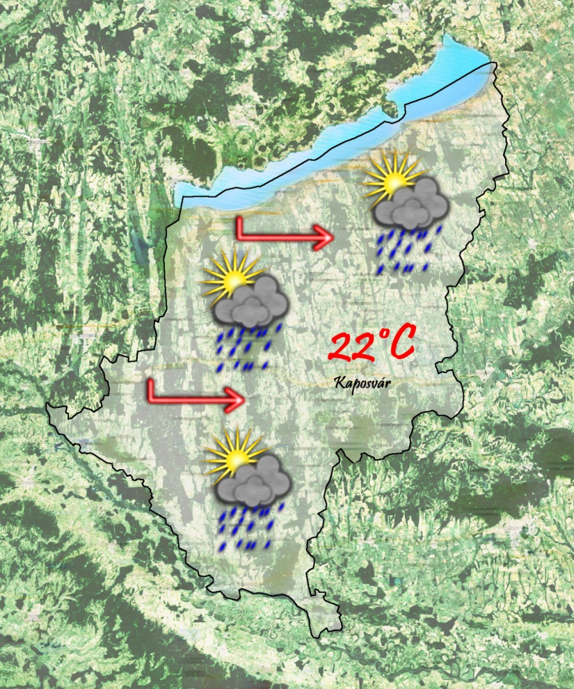 Szombaton reggel változóan felhős lesz a ég. 14°C-ig csökken a hőmérséklet, majdhogynem fülledt lesz a levegő a pára miatt. Délutánra 22°C-ig szökik fel a hőmérő. Szinte bármikor lehetséges ismét zápor és zivatar. Szeszélyes napra számíthatunk, de enyhe lesz az idő. Gyenge nyugati szél fog fújni.