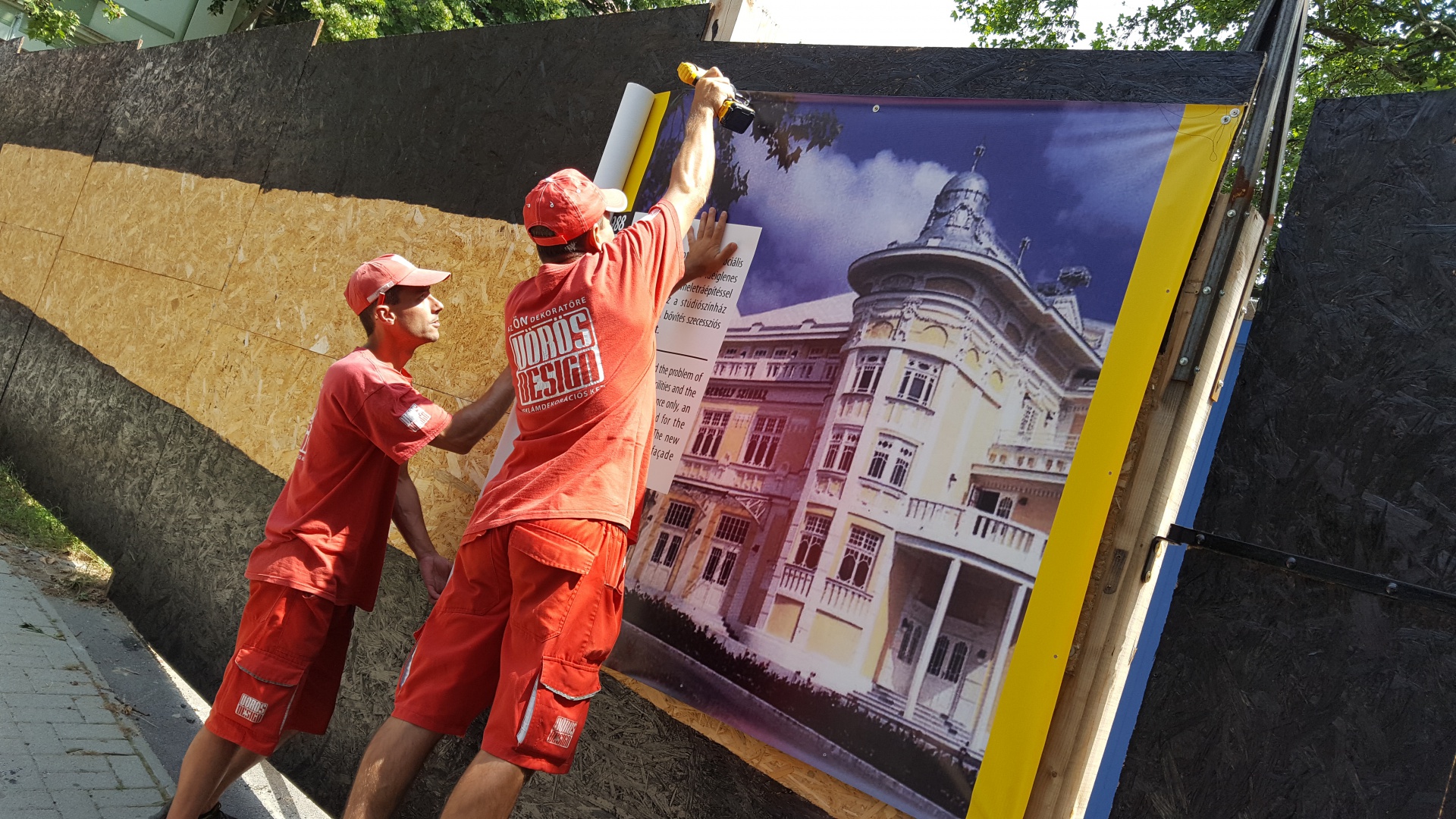 Az unalmas OSB-falat először feketére festették, szerdán pedig már molinókkal borították be a grafikusok.