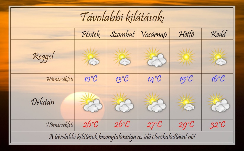 Pénteken reggel változóan felhős lesz az ég és meglehetősen alacsonyra, 10°C-ig csökken a hőmérséklet. Napközben friss lesz az idő. 26°C-ig kúszik fel hőmérő higanyszála. Nyugodt, nyárias és friss napra számíthatunk. Csapadéktól megintcsak nem kell tartani.