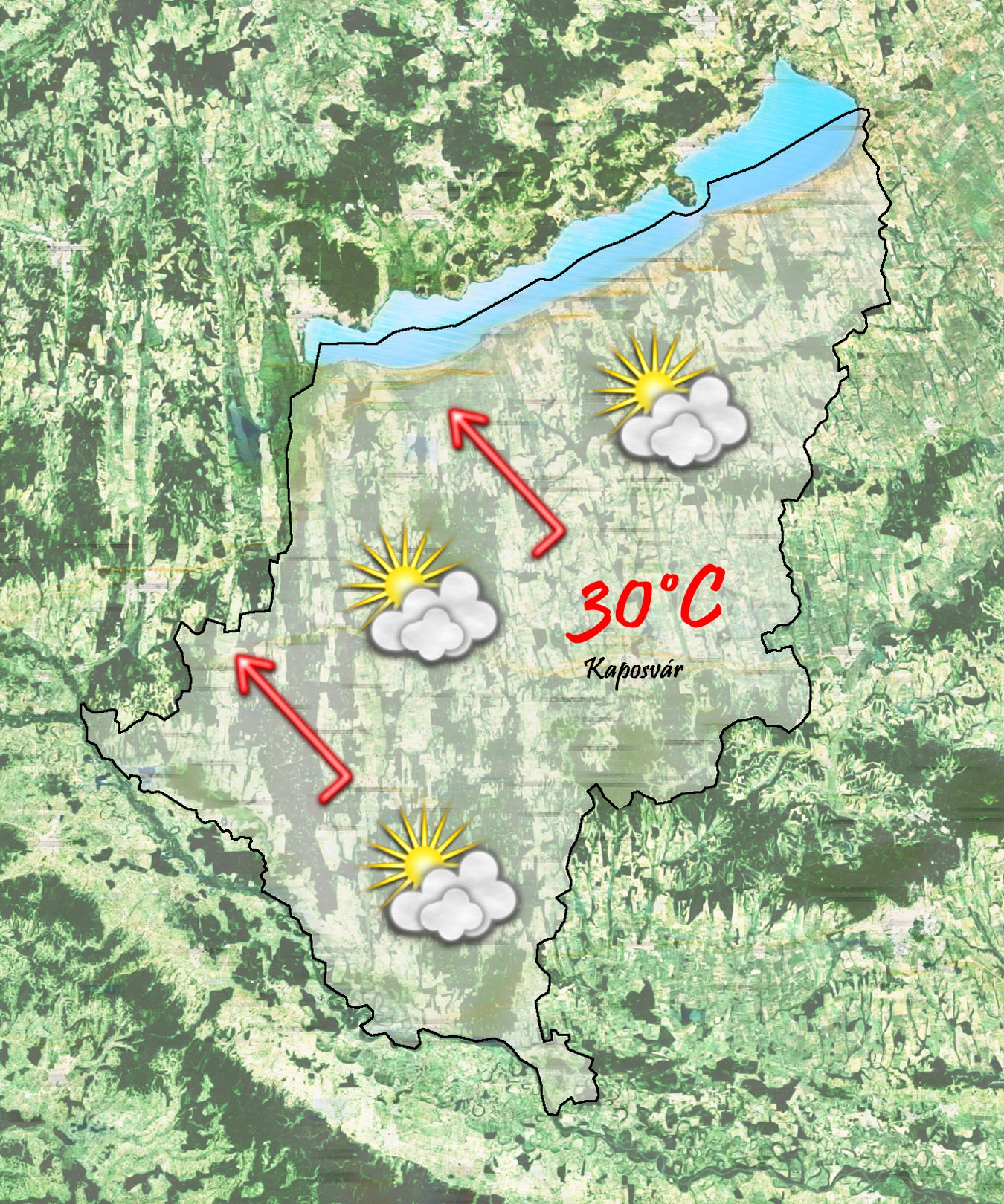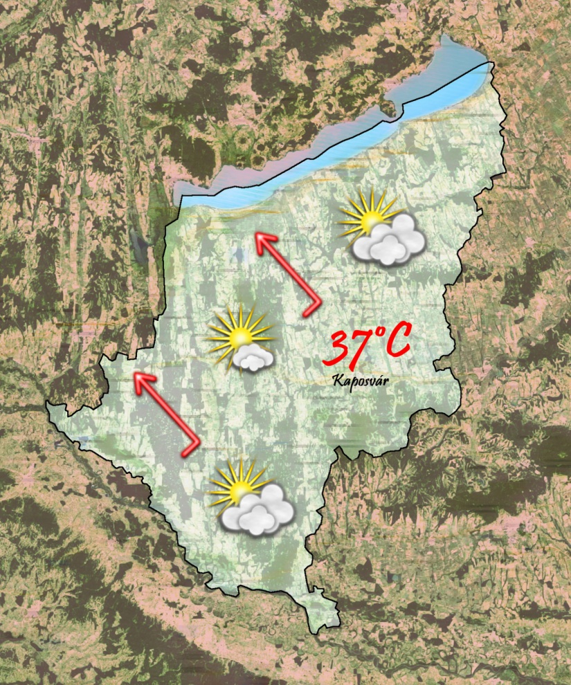 Szerda reggel gyengén felhős lesz az ég és 18°C-ig csökken a hőmérséklet. Napközben is gyengén felhős égre számíthatunk ismét nagy meleggel. 37°C-ig is felkúszhat a hőmérő higanyszála. A szél gyengén fog fújni dél felől. Igazán forró, nyárias időnk lesz ismét.