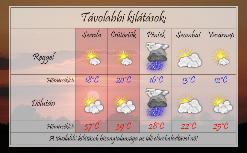 A hét második felében eleinte ismét forróság várható 35°C feletti maximumhőmérsékletekkel. Előfordulhat akár 39°C is. Pénteken viszont markáns és lassú hidegfront érkezhet ami megszünteti a kánikulát és valószínűleg csapadékot is hozhat. Míg a szombat még hűvös, szeles, záporos lehet, addig a vasárnap már nyugodt nyári időt hozhat.