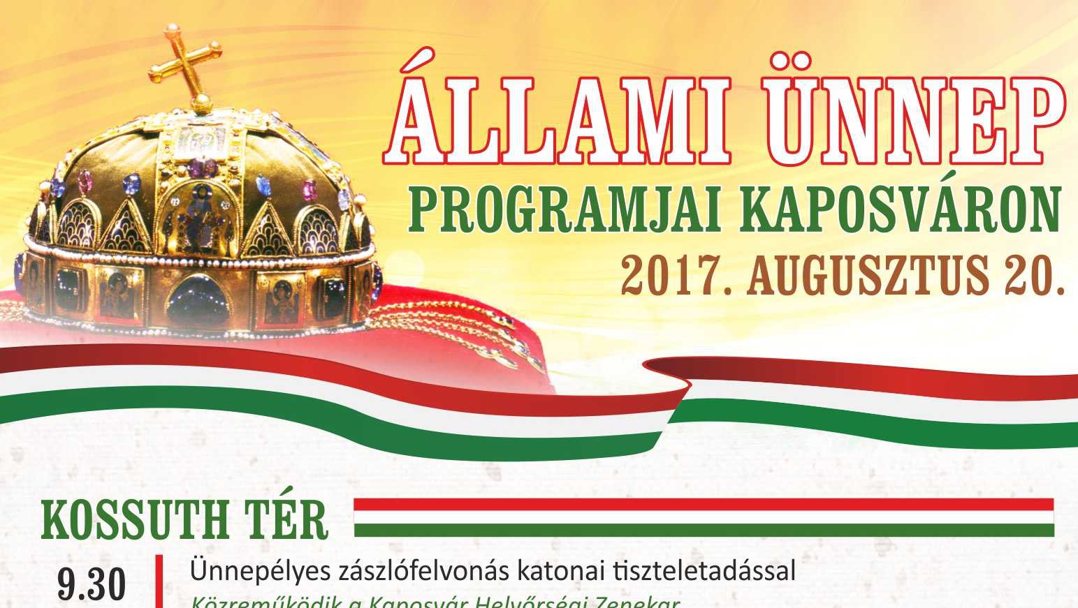 Vasárnap délelőtt az ünnepélyes zászlófelvonás, kenyérszentelés, ünnepi műsor várja a kaposváriakat a Kossuth téren. Délután a Városligetben gyermekprogramokkal és felnőtteknek szóló műsorokkal is készültek a városlakóknak a szervezők. Este a Somogy Tánceggyüttes műsora után jön az ünnepi tűzijáték.