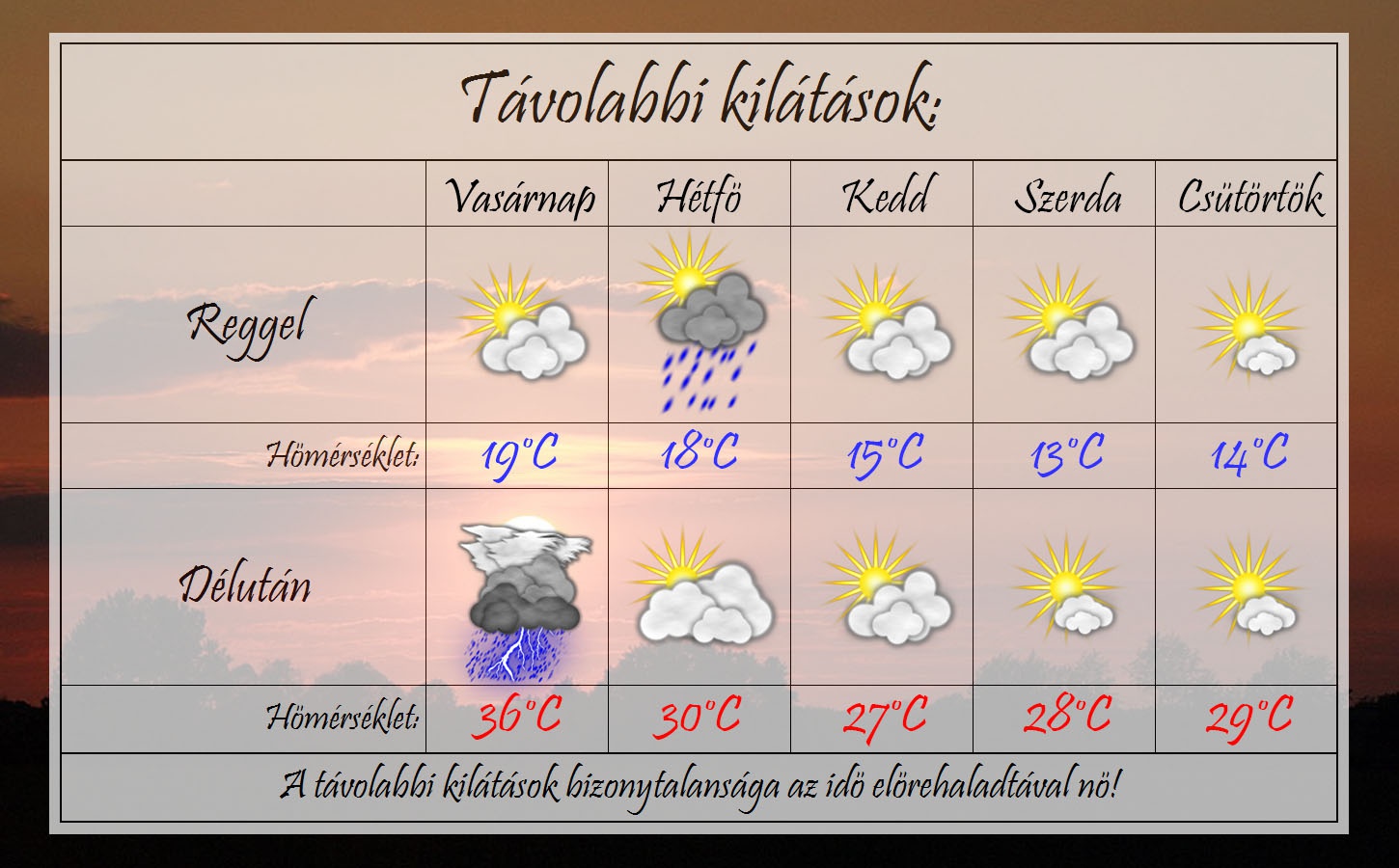 Vasárnap reggel 19°C közelébe csökken a változóan felhős ég alatt. A maximumhőmérséklet 36°C-ig szökik fel és délután előfordulhat néhol egy-egy zivatar is. Délnyugati szél fog fújni. Estétől már több helyen is lehet zivatar egy közeledő hidegfront miatt.