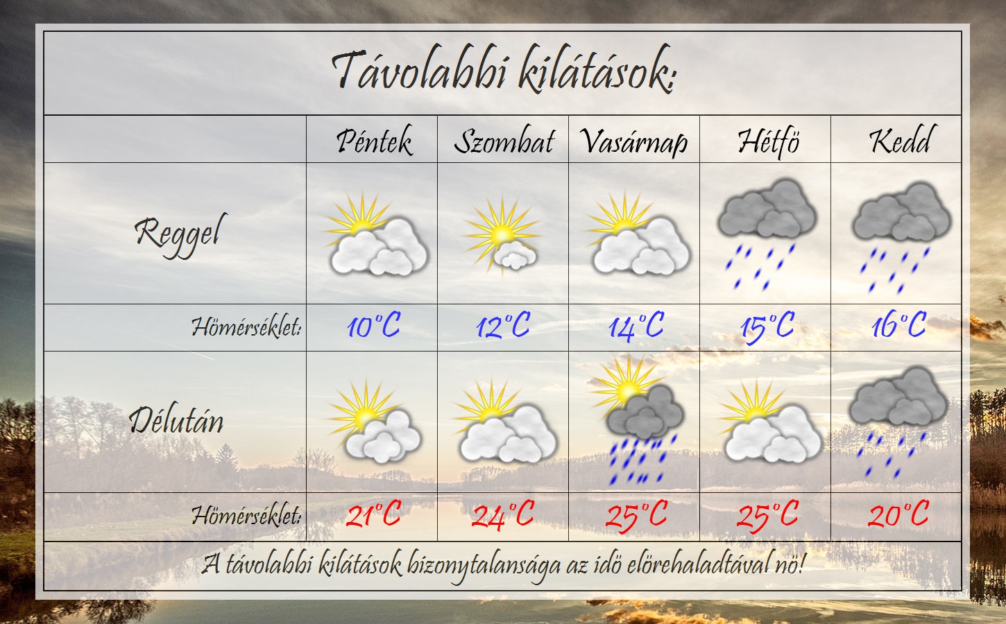 Péntek reggel még erősen felhős lesz az ég és 10 °C-ig csökken a hőmérséklet, de napközben már felszakadozik a felhőzet. 21 °C-ig kúszik fel a hőmérő higanyszála. A szél gyengén fog fújni nyugat felől.