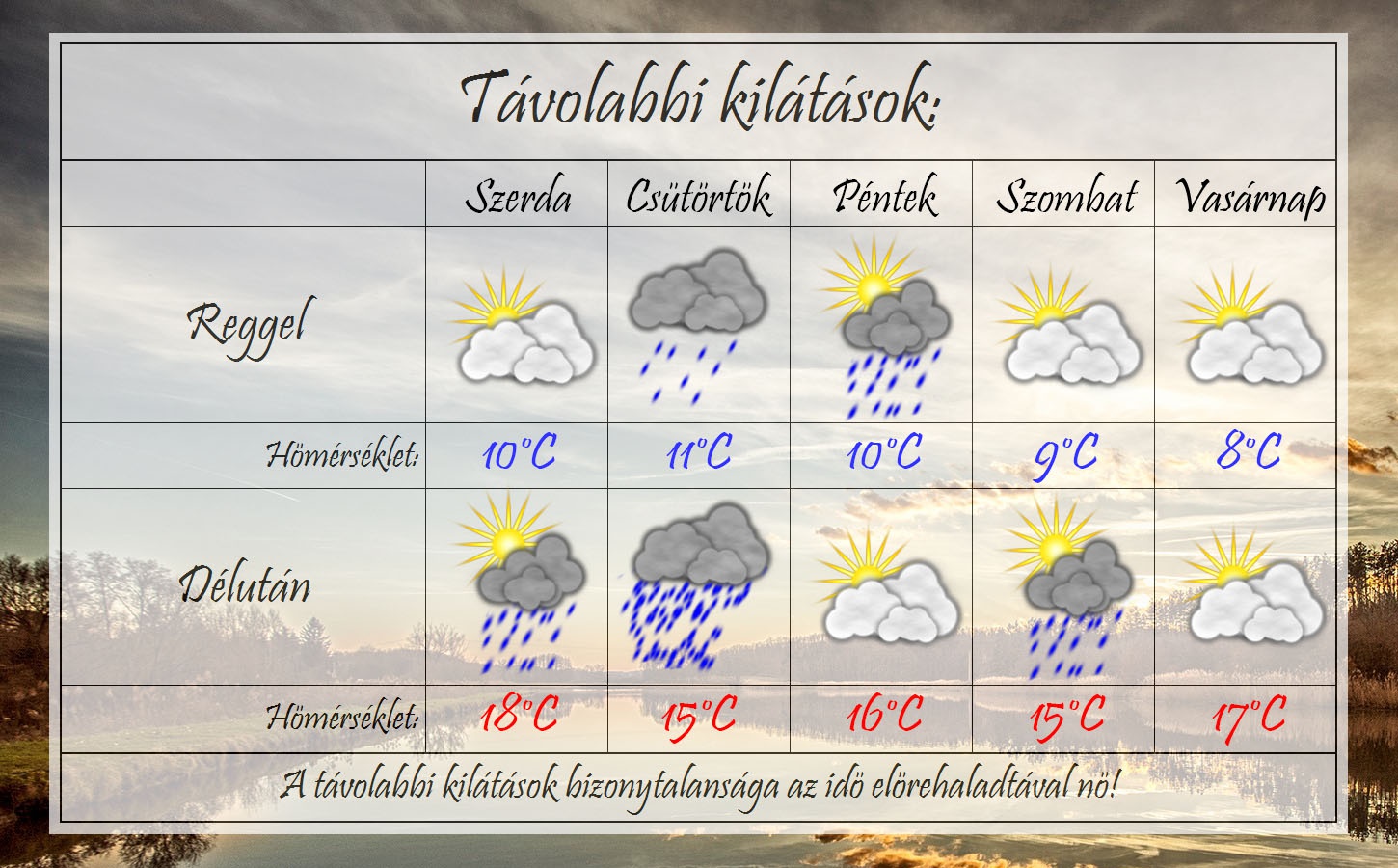 Szerda reggel erősen felhős lesz az ég és 10°C-ig csökken a hőmérséklet, tehát meglehetősen hűvös lesz. Napközben is marad az erősen felhős ég és bármikor lehet kisebb eső, zápor. 18°C-ig is felkúszhat a hőmérő higanyszála. A szél gyengén fog fújni északnyugat felől. Igazi őszies idő várható.