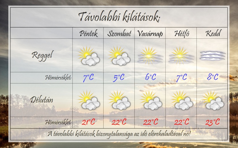 Pénteken folytatódik a nyugodt idő. Reggel kevés felhő lesz felettünk és 7°C-ig csökken a hőmérséklet. Napközben a gyengén felhős ég alatt 20°C-ig kúszik fel a hőmérő higanyszála. Napközben megélénkül az északnyugati szél.