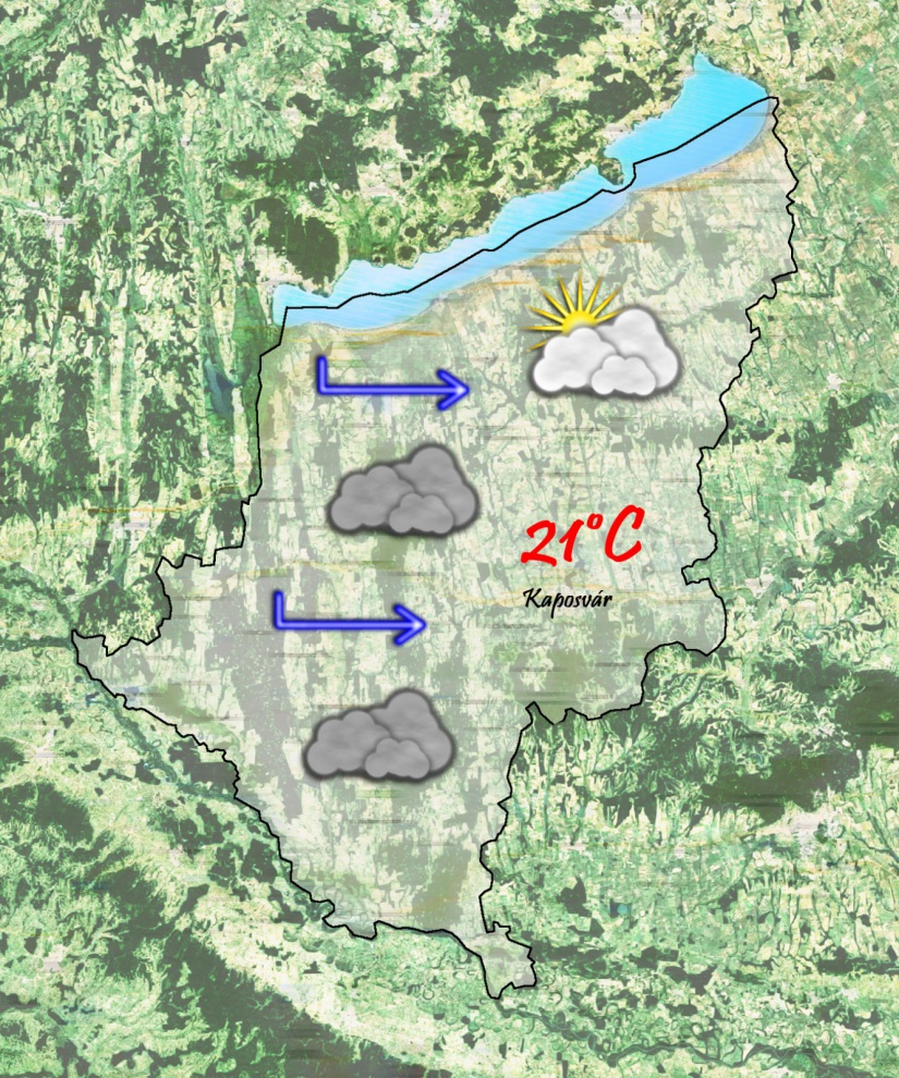 Szombat reggel a változóan, erősen fátyolfelhős ég alatt 8°C-ig csökken a hőmérséklet. Néhol előfordulhatnak ködfoltok, melyek napközben feloszlanak. Délutánra 21°C-ig melegszik a levegő és ekkor már szinte teljesen borult lesz az ég. Gyenge nyugati szél fog fújni.