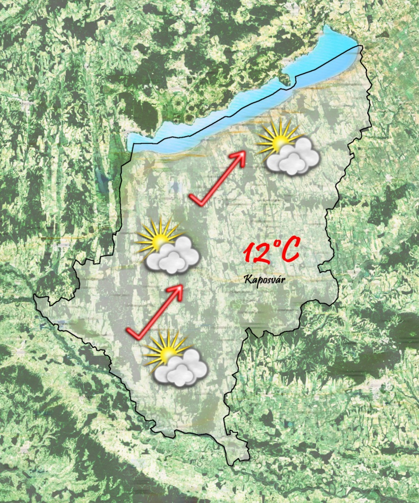 Szerdán reggel 1°C-ra süllyed a hőmérséklet, míg napközben 13°C-ig melegszik a levegő hőmérséklete. Egy kicsivel többet fog sütni a nap és melegebb is lesz. A szél délnyugat felől kezd el fújni.