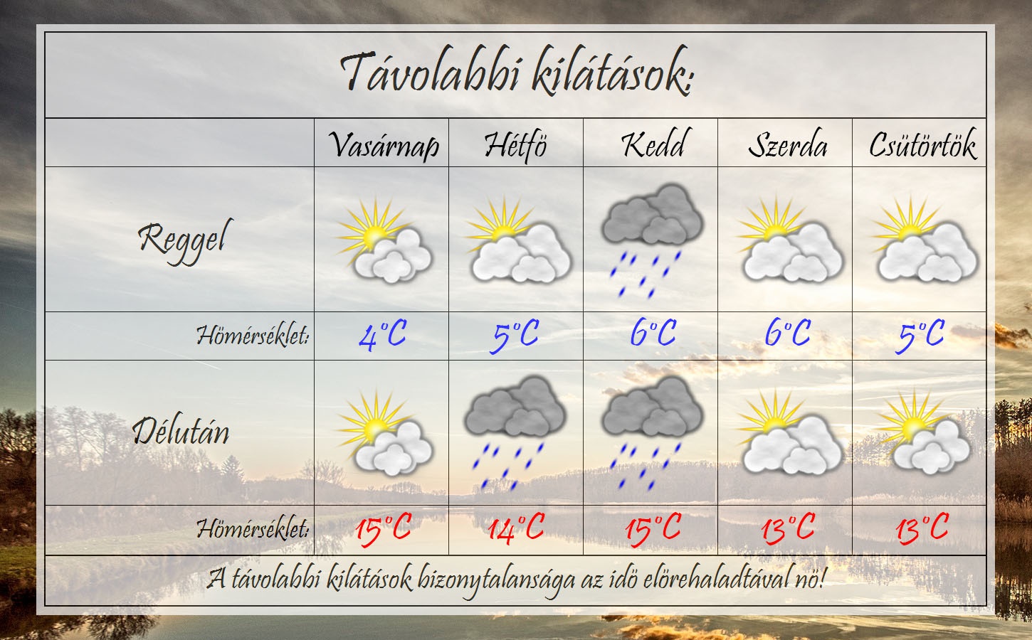 Vasárnap reggel a gyengén felhős ég alatt 4 °C-ra süllyed a hőmérséklet, míg napközben 15 °C lesz. Kicsivel több felhő lesz majd az égen, de csapadéktól nem kell tartanunk. Gyenge déli szél lesz továbbra is a jellemző.