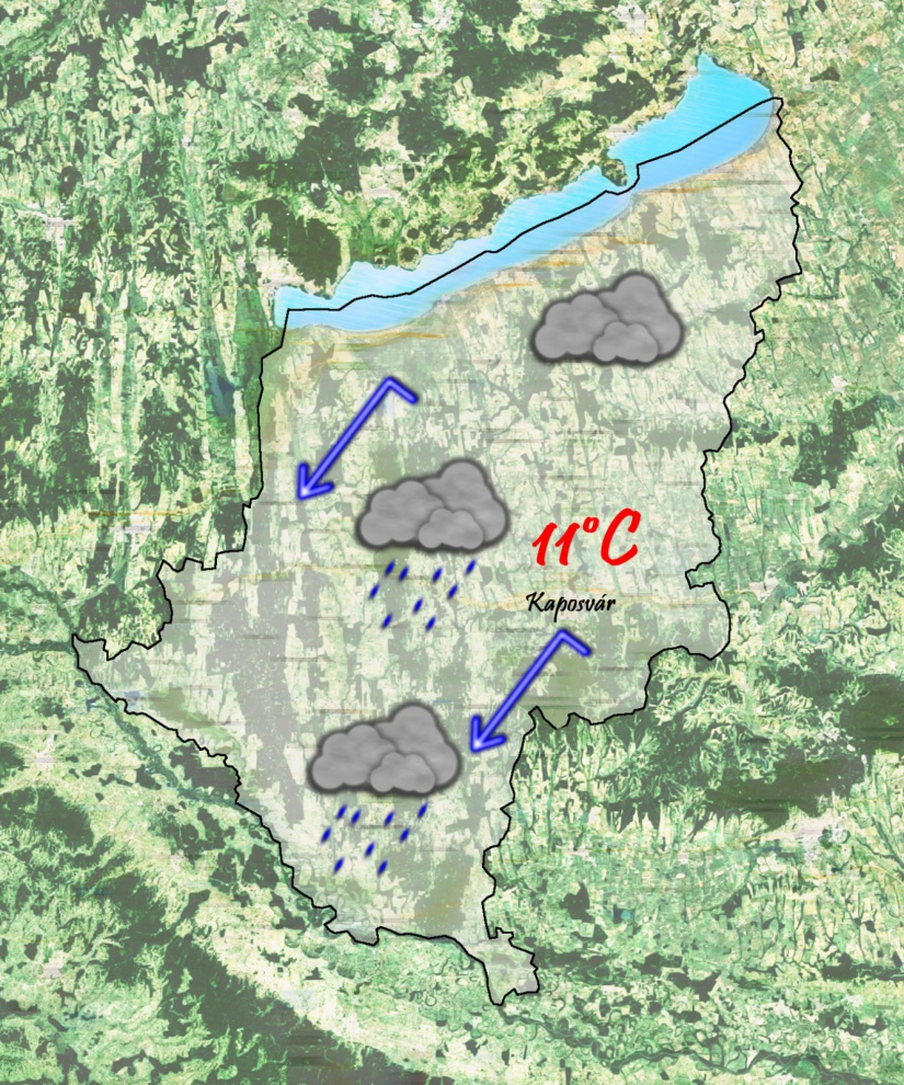Szerdán reggel 5°C-ra süllyed a hőmérséklet, míg napközben 12°C-ig melegszik a levegő hőmérséklete. Továbbra is borongós lesz felettünk az ég, és ismét előfordulhat majd kisebb eső. A szél egyre inkább északkelet felől fúj majd.