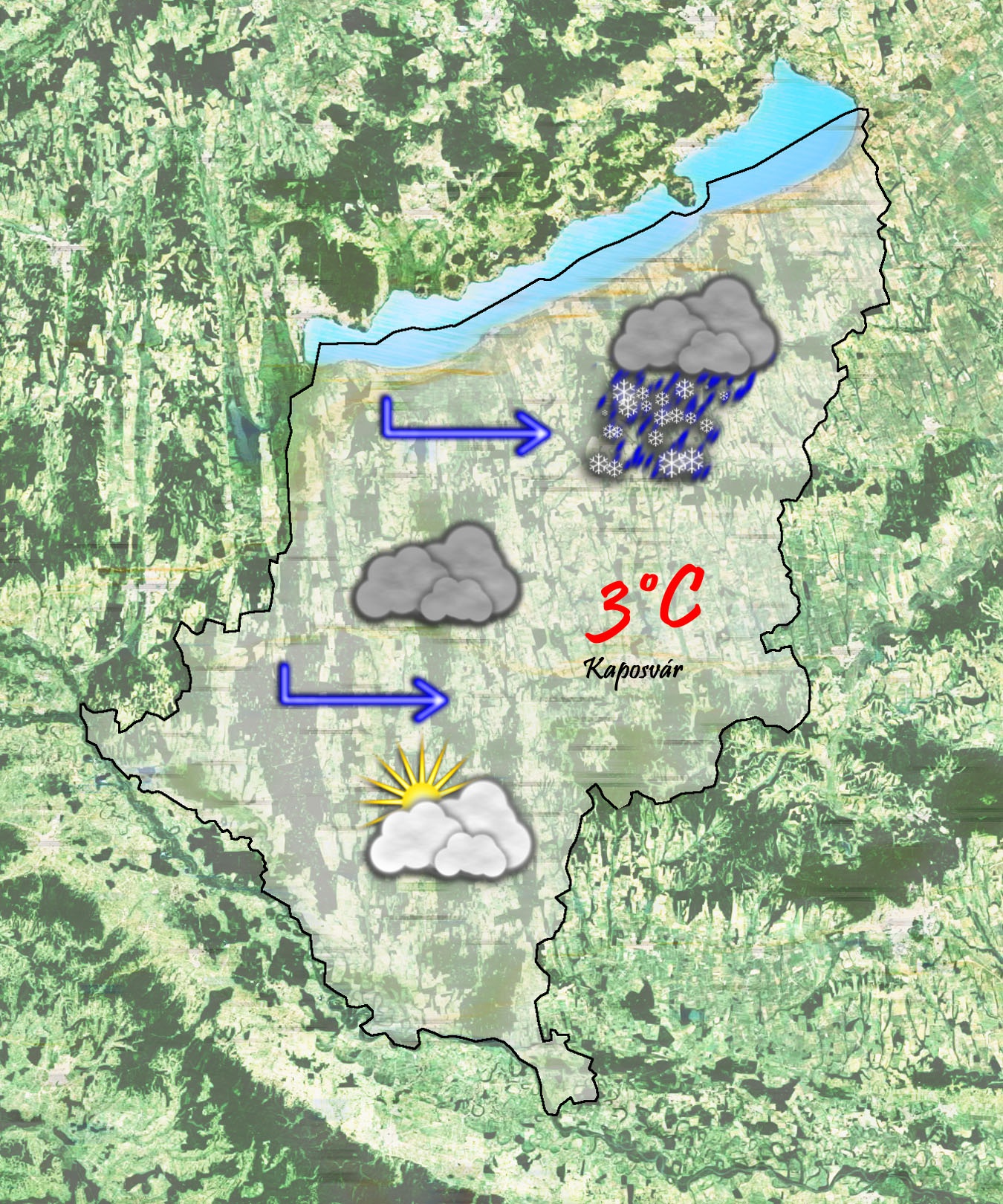 Kedd reggel a gyengén felhős ég alatt -1°C-ig csökken a hőmérséklet. Délutánra 4°C-ig melegszik a levegő és egyre több helyen lehet számítani hóra, havasesőre, esőre. A szél nyugatias leszz és gyengén fog fújni.