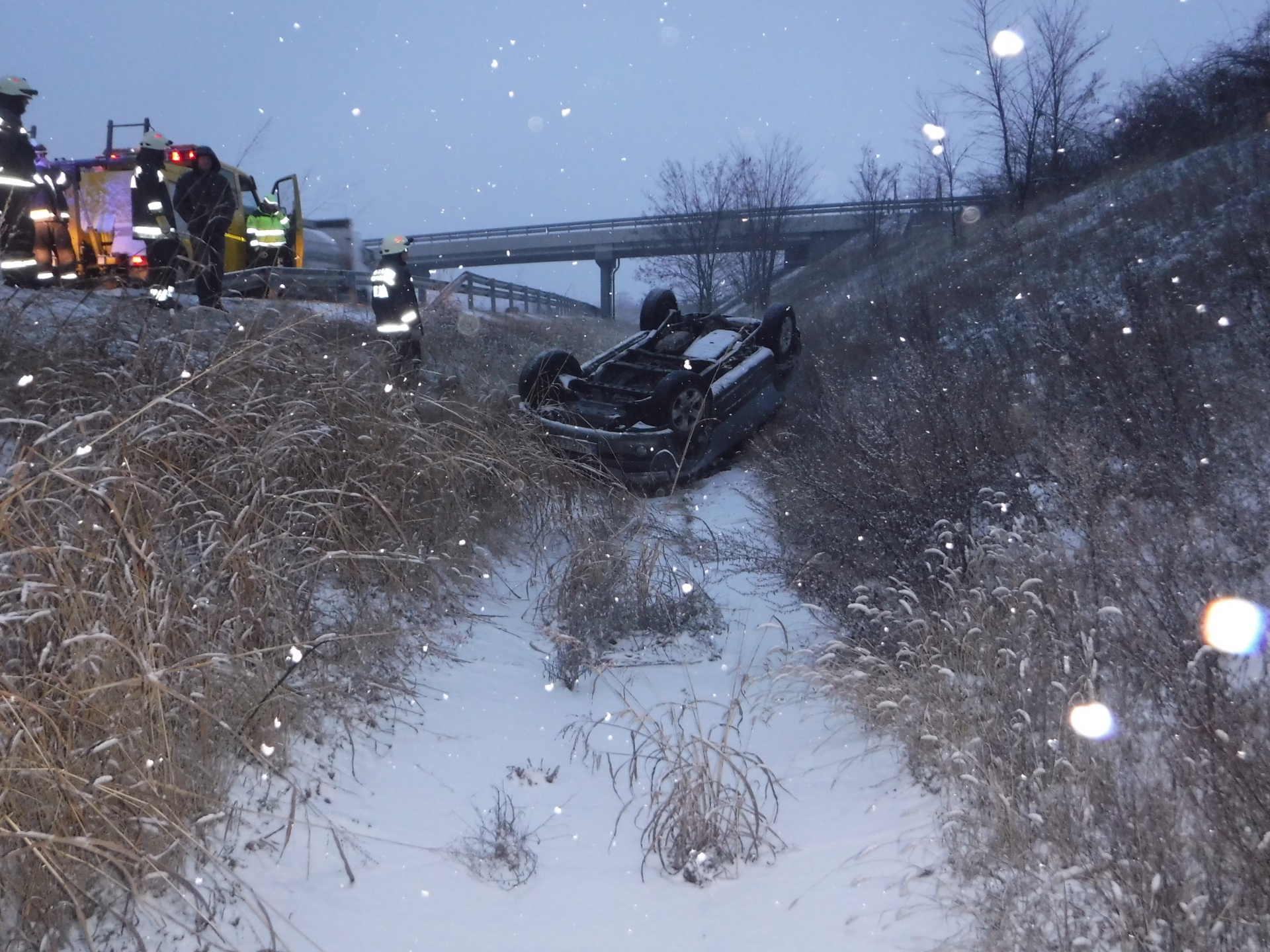 Lesodródott az úttestről és az út menti árokba borult egy gépkocsi kedd reggel az M7-es autópálya Budapest felé vezető oldalán, a 114-es kilométernél.