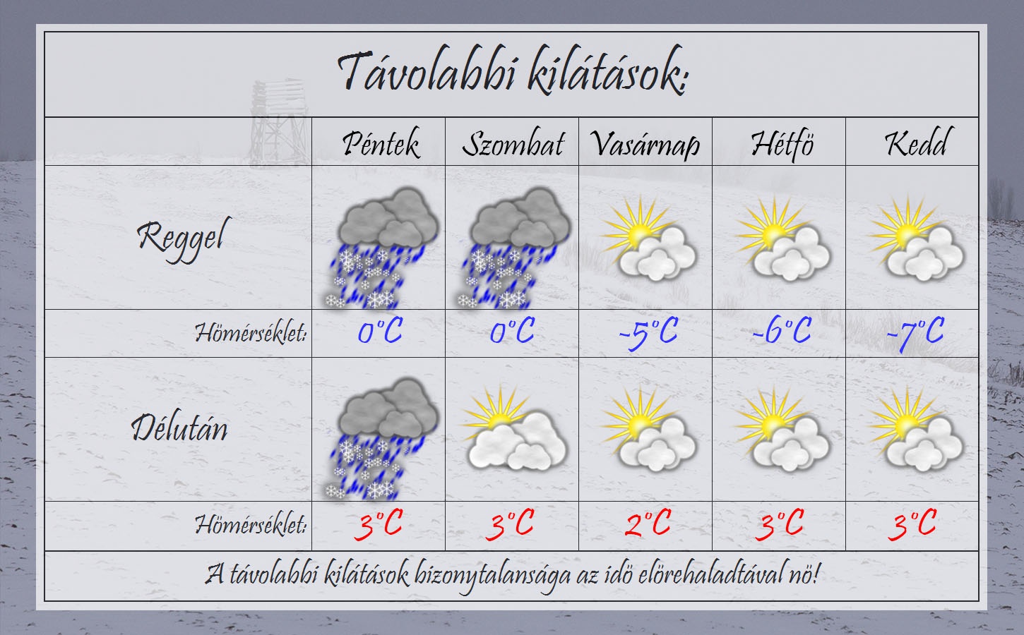 A hétvége első napján még borult lesz az ég, de csak néhol lehet gyenge eső, havaseső, havazás. Vasárnap azonban csökken a felhőzet és kisüthet a nap, de meglehetősen hideg lesz. Visszatérnek az éjszakai fagyok és napközben is 5°C alatt marad a csúcshőmérséklet. A jövő héten változóan felhős ég mellett továbbra is hideg lesz. Egy mediterrán ciklon valószínű a jövő hét közepére, mely nagy eséllyel már inkább havazást hozhat.