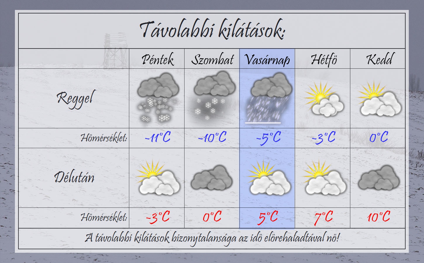 Pénteken reggel -10°C-ig süllyed a hőmérséklet. Sokfelé lehet ismét havazás, de a mennyisége még bizonytalan. Napközben borult, olykor erősen felhős lesz az ég, a csapadék súlypontja pedig kelet felé tolódik. Az keleti szél megélénkülhet. Délutánra -3°C-ig emelkedik a hőmérséklet.