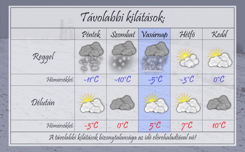 Csütörtök reggel derült, holdfényes ég alatt -20-22°C-ig csökken a hőmérséklet. Az év leghidegebb reggele a meteorológiai tavasz első hajnalára esik majd. Napközben délnyugat felől beborul az ég de komoly csapadékra még nem kell számítani. Néhol hószállingózás előfordulhat. Délután -5°C-ig kúszik fel csak a hőmérő higanyszála. A szél megélénkül délkelet felől.