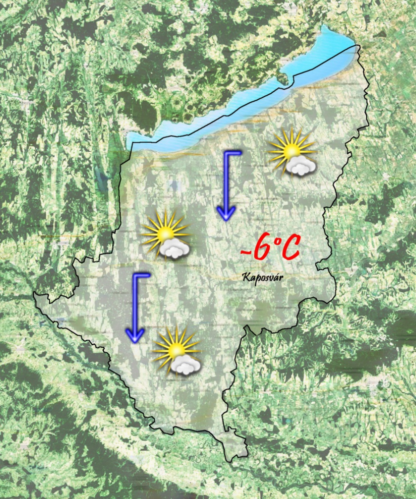Szerda délután derült, szikrázóan napos idő várható. Csapadék nem valószínű. -6°C-ig melegszik a levegő és gyengén fog fújni az északi szél. Az este folyamán igen mélyre hűl a levegő hőmérséklete.
