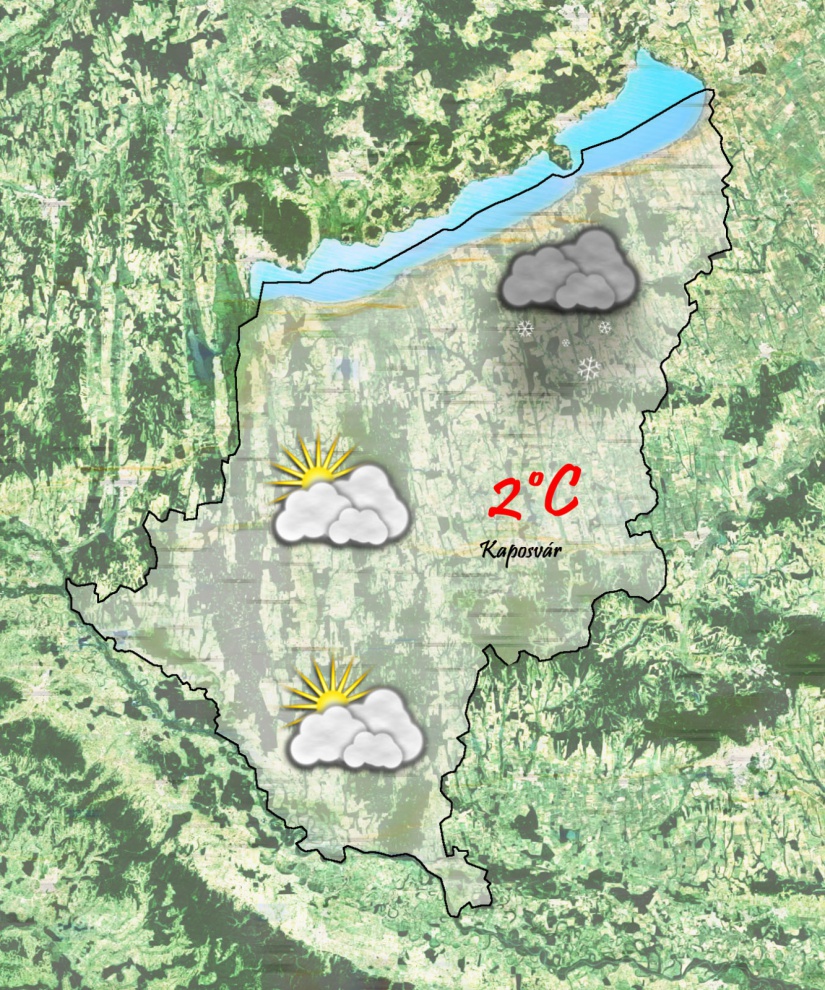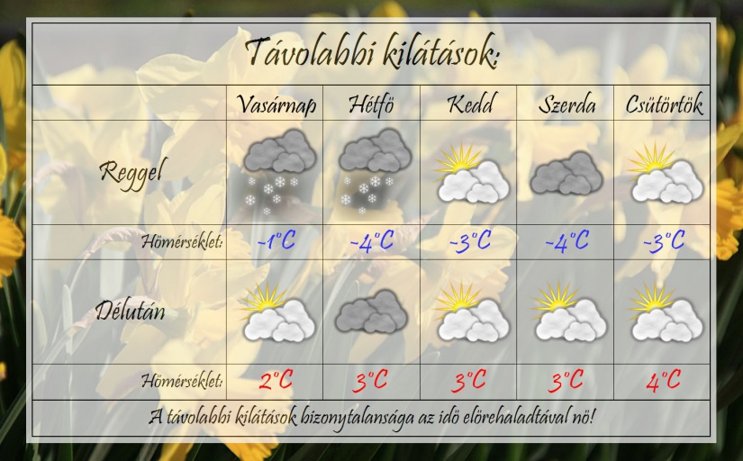 Vasárnap reggel -3°C-ig csökken a levegő hőmérséklete. Csapadék egyre inkább havazás lesz majd, de annak intenzitása az idő előrehaladtával csökken majd. A magasabban fekvő területeken előfordulhat néhány centiméteres hótakaró. Élénken fog fújni az északkeleti szél. Délutánra 2°C-ig kúszik fel csak a hőmérő higanyszála. Gyakorlatilag téli nap várható már.
