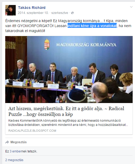 A Lázár döntésén megdöbbenő Radical puzzle nevű blog egy kormányülésen készített fotó apropóján rögvest kommentálta is a miniszter lépését, ez a cikk került megosztásra a fasiszta szöveggel Takács Richárd neve alatt. A bejegyzésnek akadtak támogatói is: hárman lájkolták, ketten meg is osztották a durva tartalmat.