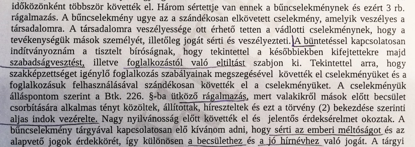 „A bűncselekmény ugye az a szándékosan elkövetett cselekmény, amelyik veszélyes a társadalomra. A társadalomra veszélyessége ott érhető tetten a vádlotti cselekménynek, hogy a tevékenységük mások személyét, illetőleg jogát sérti és veszélyezteti. A büntetéssel kapcsolatosan indítványoznám a tisztelt bíróságnak, hogy tekintettel a későbbiekben kifejtettekre majd szabadságvesztést, illetve foglalkozástól való eltiltást szabjon ki.”