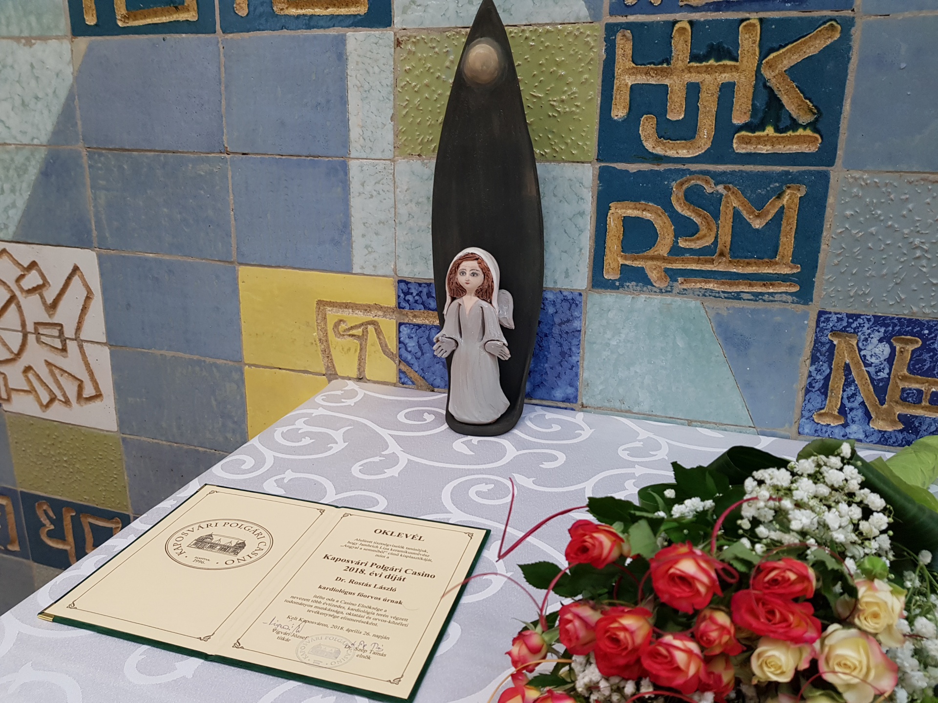 A Kaposvári Polgári Casino idei díjával egyetemben dr. Rostás László átvehette Jambrik Liza keramikusművész, "Angyal a semmiből" kisplasztikáját is.