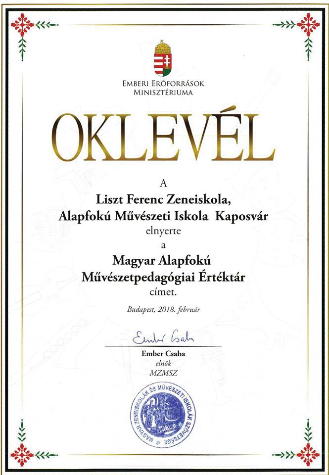Magyar Alapfokú Művészetpedagógiai Értéktár címet a Kaposvári Liszt Ferenc Zeneiskola szerdán. Az elismerést Nagy Tamás intézményvezető vette át.